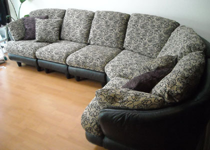背と座面のクッションカバーを作り直しました。モノトーンの生地と黒革のコンビが素敵です