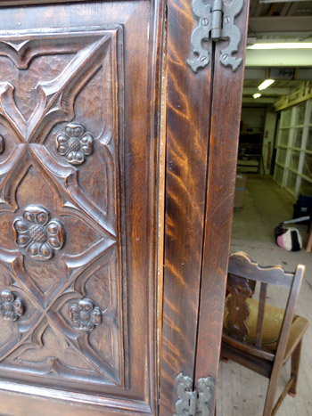 扉の付け根の割れを補修し再塗装。昔の家具は手が込んでいます