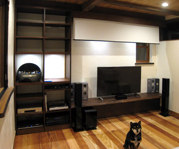 ▼スクリーンを降ろすとテレビが隠れ、リビングがシアターに早変わり!