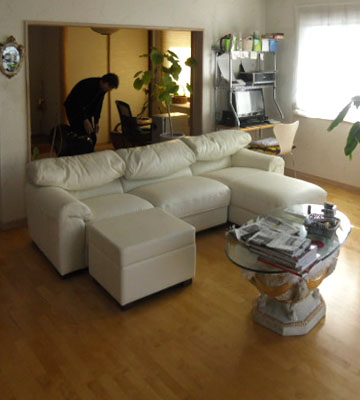 お持ちのソファを部分的に張替えし、さらにおそろいのオットマンを製作しました
